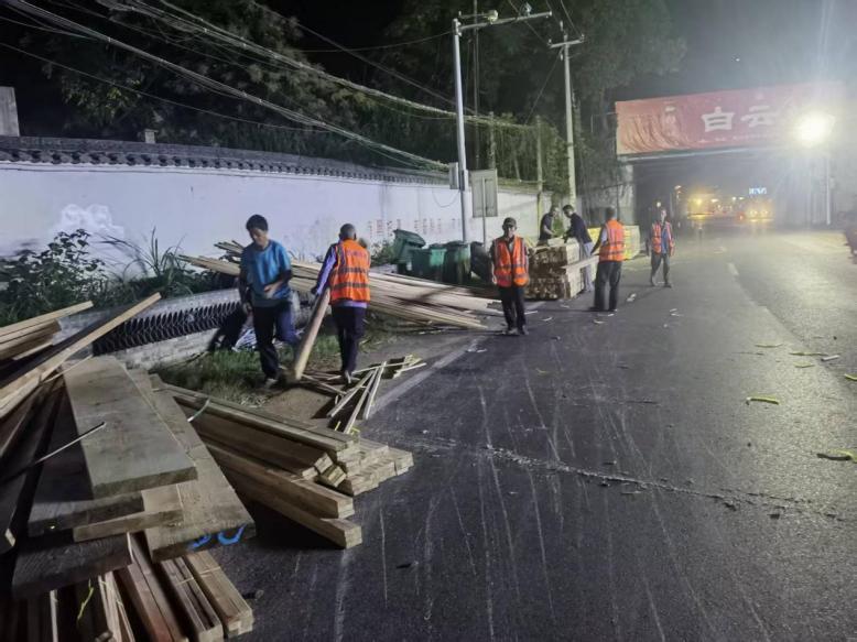 10月4日凌晨,德興公路事業發展中心養護人員快速處置一起散落木材影響公路安全事件,確保公路安全暢通。