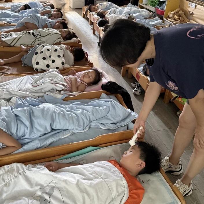 考慮到午睡環節是幼兒園安全管理的高風險點,培訓還聚焦午睡看護細則。保健醫生強調,午睡是幼兒能量補給的關鍵時段,需以極大的耐心、細心與責任心筑牢安全防線。并明確“一問二查三測”的午睡前安檢流程,即詢問幼兒身體狀況、檢查口腔及隨身物品、測量體溫;細化“四巡五看六聽”的午睡中動態監護要求,包括定時輕步巡視、觀察面色呼吸睡姿、傾聽呼吸及異常聲響,全方位規范午睡管理。