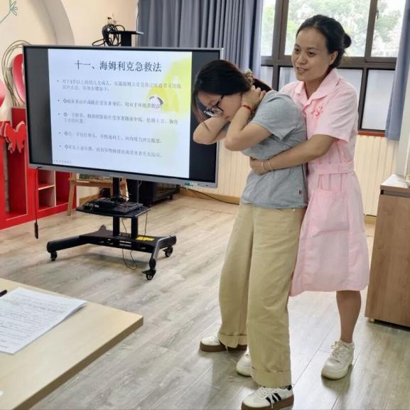 海姆立克急救法實操是本次培訓的重點環節。保健醫生與教職工采取“兩人一組、角色扮演”的實戰模式,分步演示標準操作:針對幼兒,講解如何準確定位并實施拍背法與胸部沖擊法;針對成人互救,示范背后腹部沖擊動作;針對自救,指導利用椅背等物體進行應急處置。從園長到教師再到后勤人員,全員參與實操演練,在專業指導下互相切磋、糾正手法,確保每一個動作都標準規范,保障黃金救援時間內的處置效果,現場學習氛圍嚴謹熱烈。