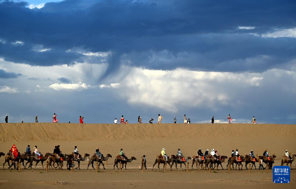 6月21日,游客在甘肅省敦煌市鳴沙山月牙泉景區游覽拍照。