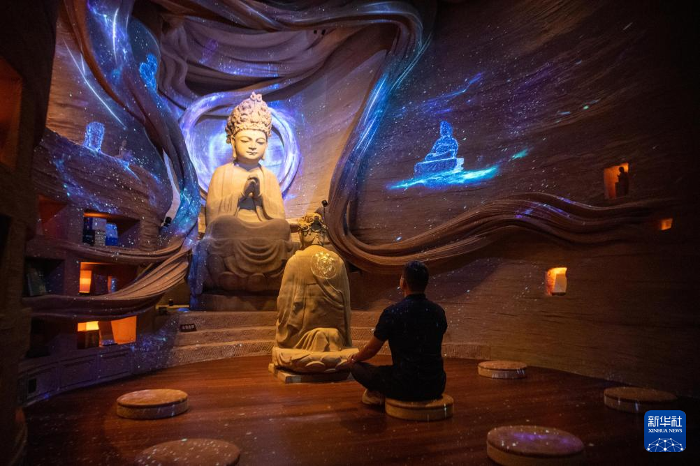 6月24日,游客在大足石刻景區一處數字化聲光場景中體驗。