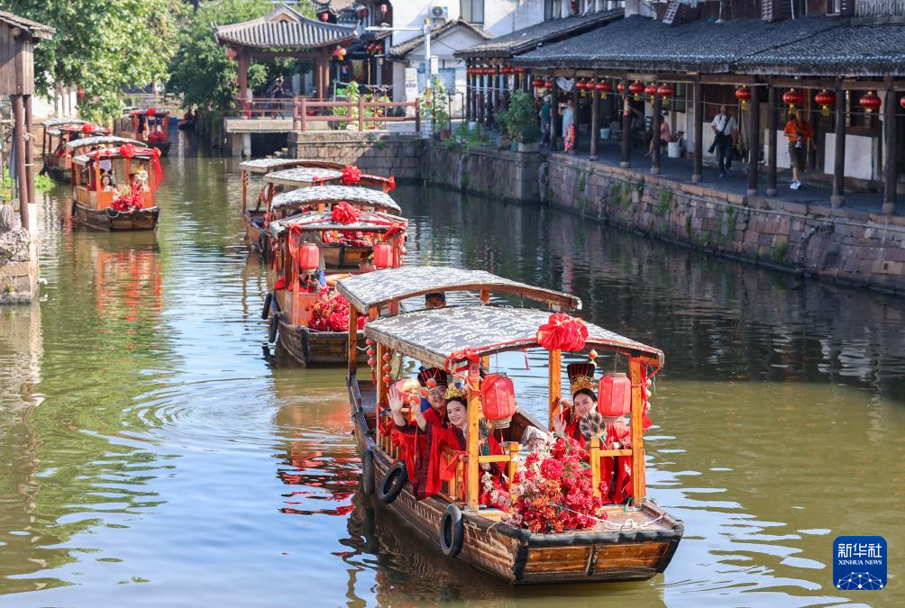 當(dāng)日,浙江省湖州市16對新人在德清縣新市古鎮(zhèn)舉行傳統(tǒng)形式集體婚禮,倡導(dǎo)婚事新辦簡辦,演繹“中式浪漫”。