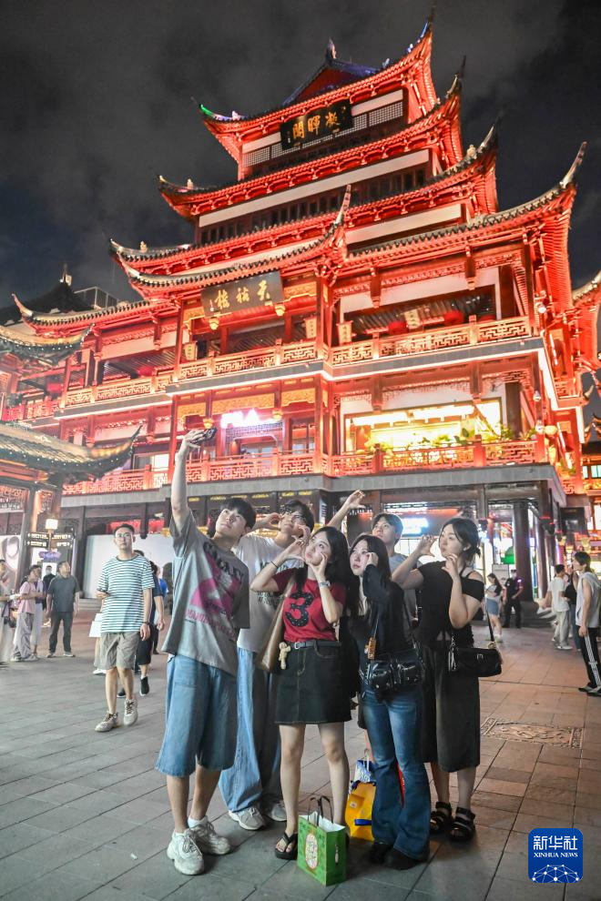 7月21日晚,奧地利游客在上海豫園商城拍攝漢服寫(xiě)真。
