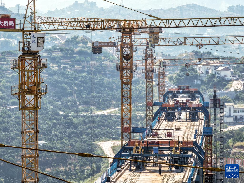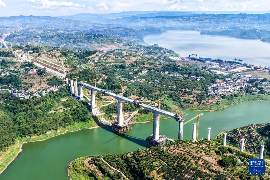 這是8月18日拍攝的渝萬高鐵渠溪河雙線特大橋施工現場(無人機照片)。