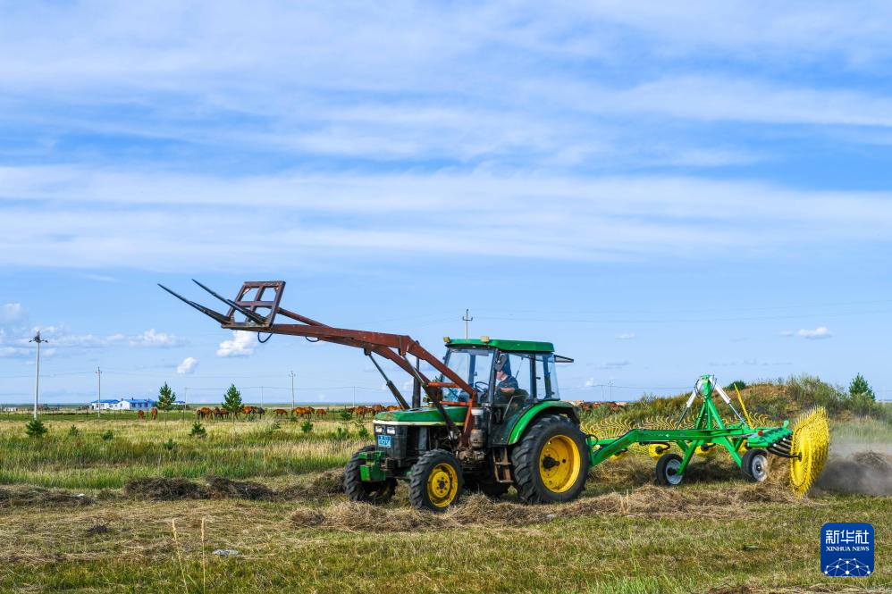 初秋時節,內蒙古呼倫貝爾大草原草色漸黃。在遼闊的草原上,牧民將豐收的牧草捆扎成卷,成群的牛羊、馬匹漫步其間,勾勒出一幅祥和美麗的秋日豐收圖景。