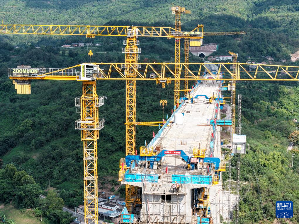 這是9月24日拍攝的渝萬高鐵五步河雙線特大橋建設現(xiàn)場(無人機照片)。